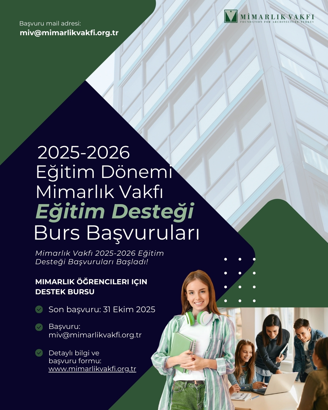 Mimarlık Vakfı Eğitim Desteği Çalışma Grubu (MİV-EDÇG), üniversitelerin Mimarlık Fakültelerinde lisans eğitimi gören öğrencilere yönelik 2025-2026 öğrenim dönemi burs başvurularını kabul etmektedir.